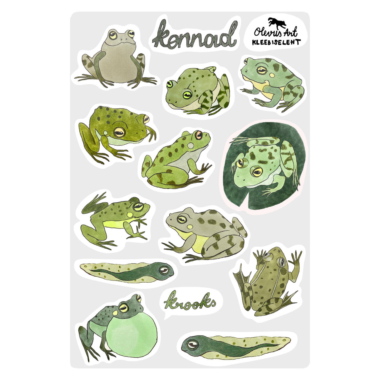 There are 12 stickers with drawn frogs on the page and the words "konnad" (frogs in Estonian) and "krooks" are also stickers :)