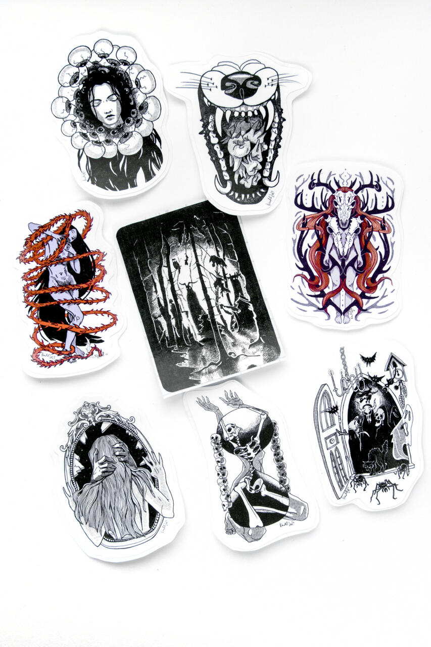 This sticer set consists of eigth different drawings that I drew during the month of October 2021 in a drawing challenge : )When you look at the main photograph, the drawings are following: