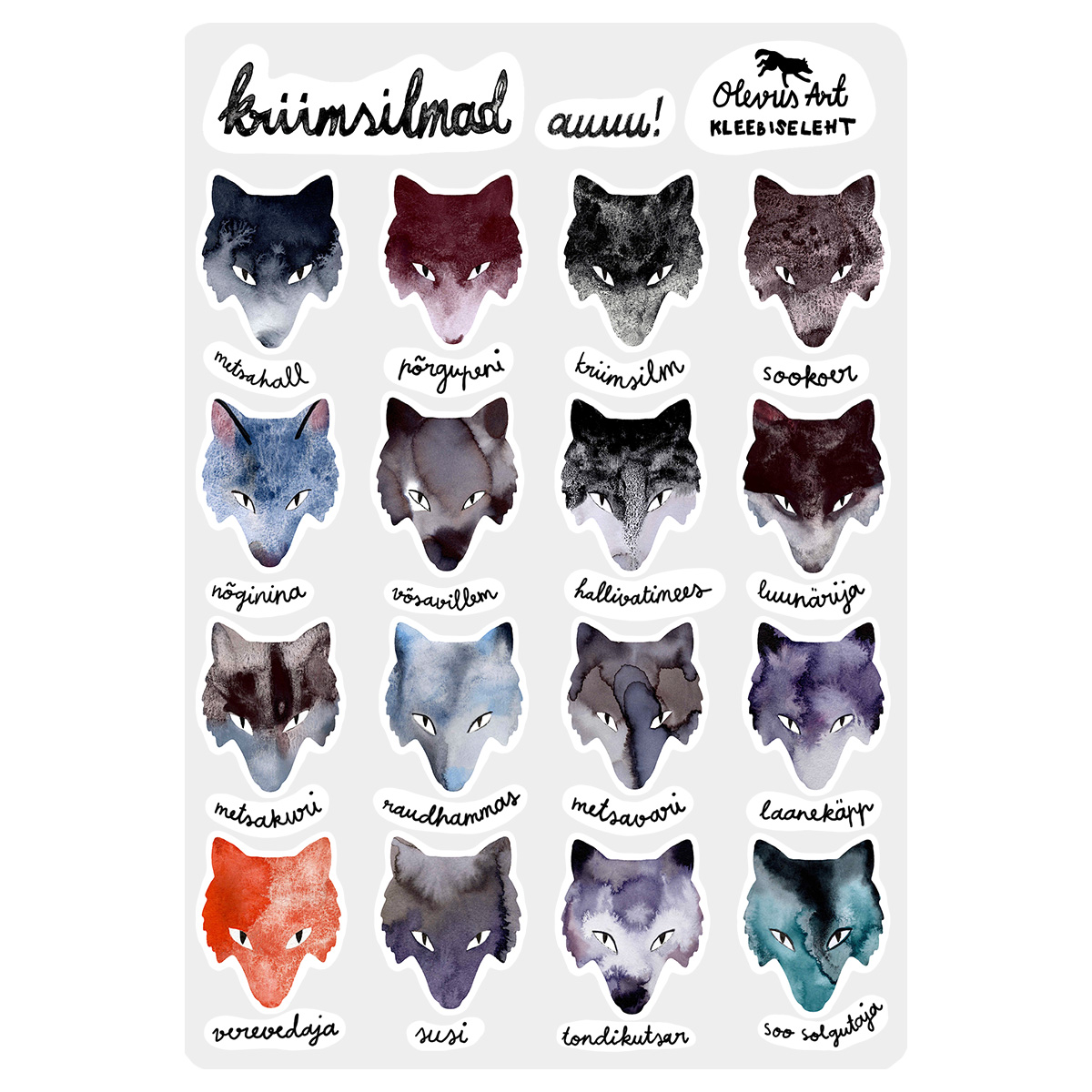 Wolf is an animal who has most likely the most synonyms in Estonian. On this sticker sheet there are painterly wolf faces with wolf synonyms under them.