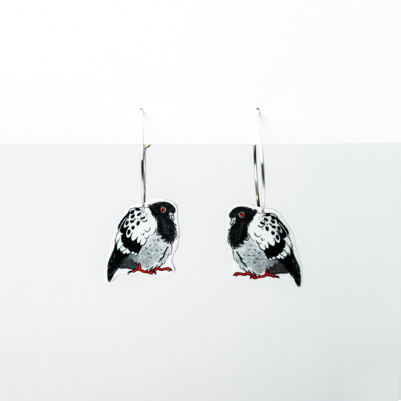 Hoop earrings with drawn pigeons with puffed feathers : )