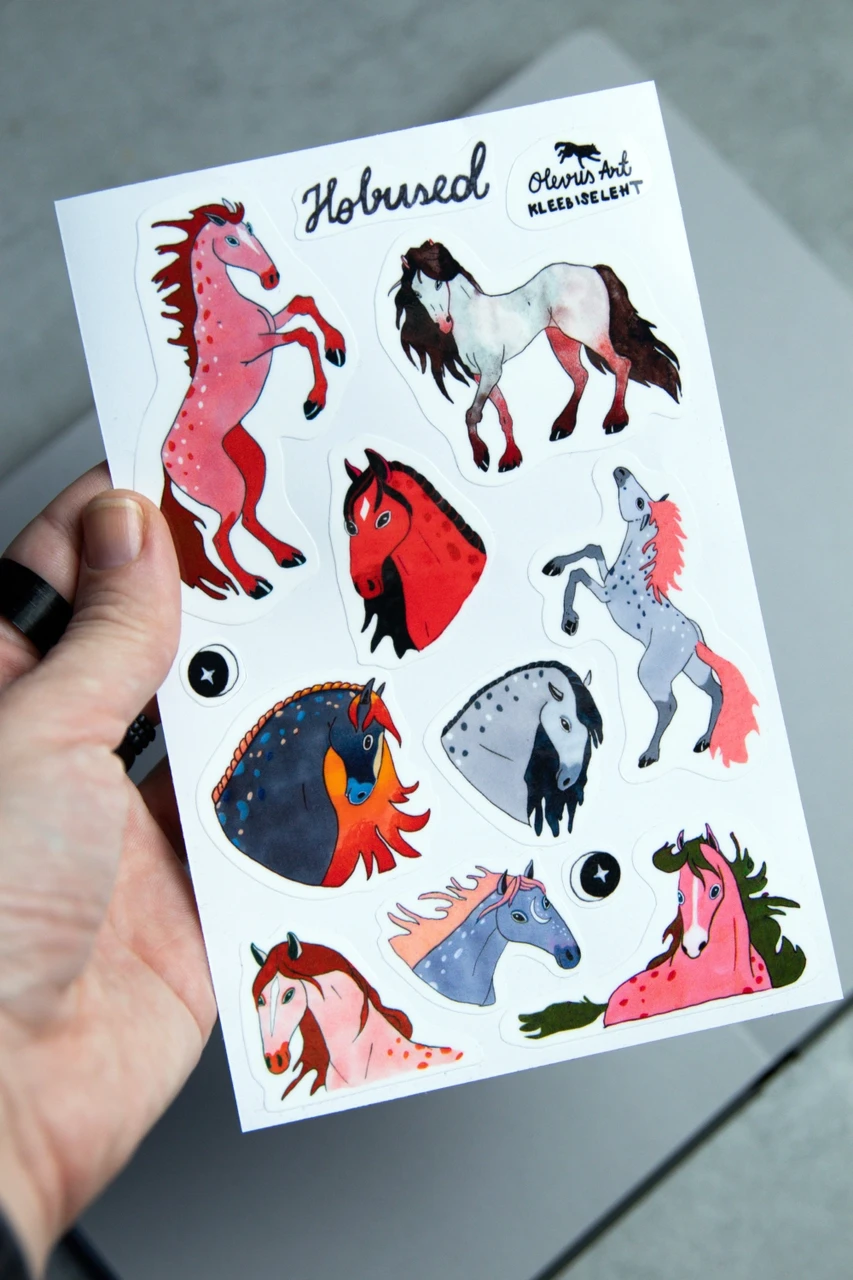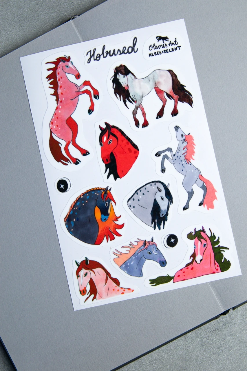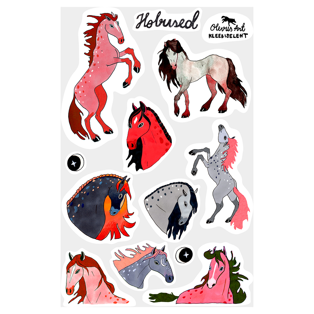 Lehel on 9 Olevus Art joonistatud hobusega vinüülmaterjalist kleepsu. Ka sõna "Hobused" on kleeps :)