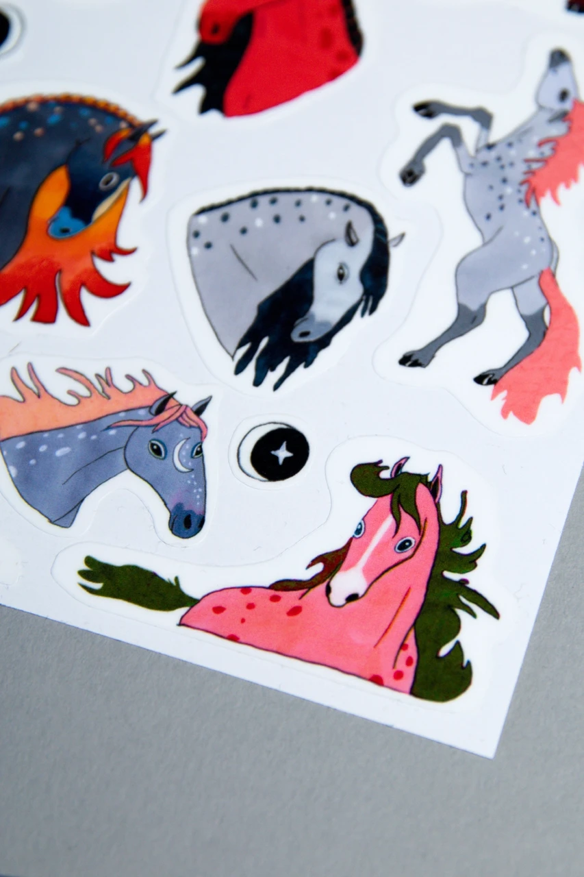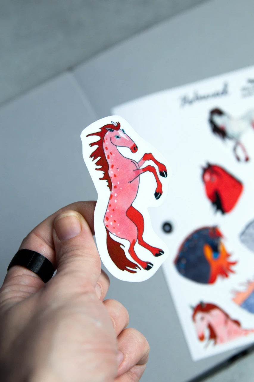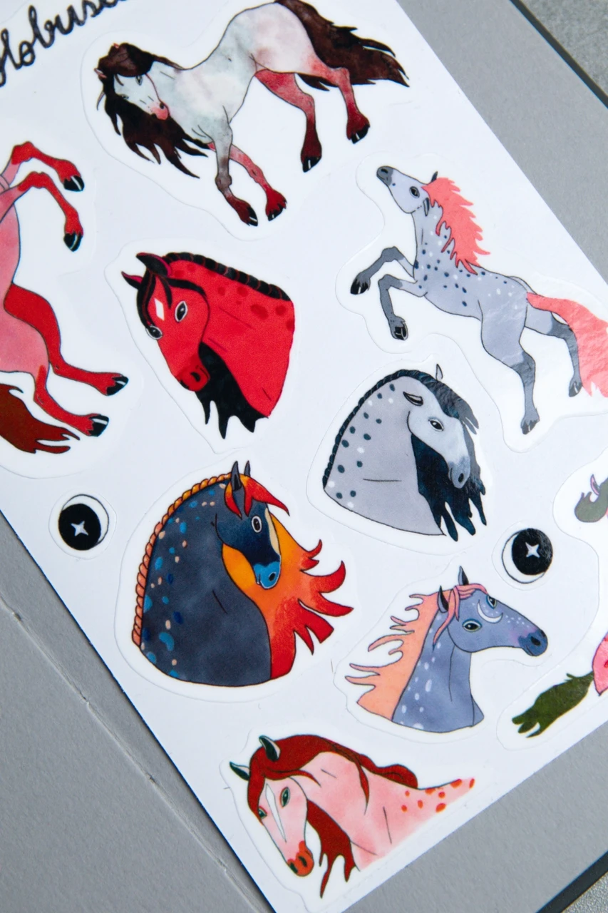 Lehel on 9 Olevus Art joonistatud hobusega vinüülmaterjalist kleepsu. Ka sõna "Hobused" on kleeps :)