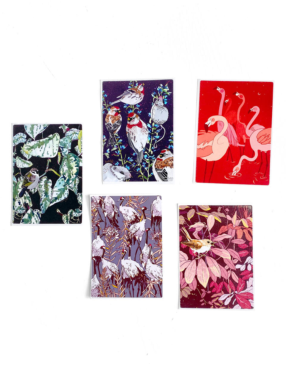 Kleebisekomplekt koosneb viiest erineva linnujoonistusega kleebisest.