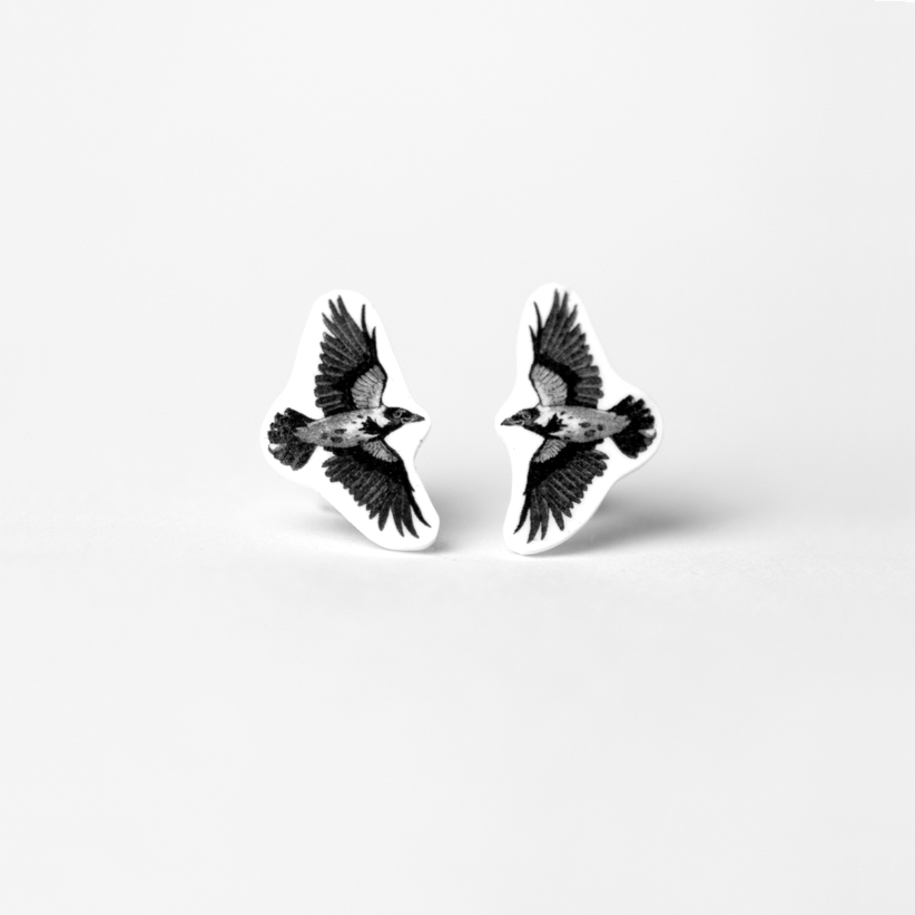 Postkinnitusega pisikesed varesed on joonistusega käsitööna valminud kõrvarõngad.