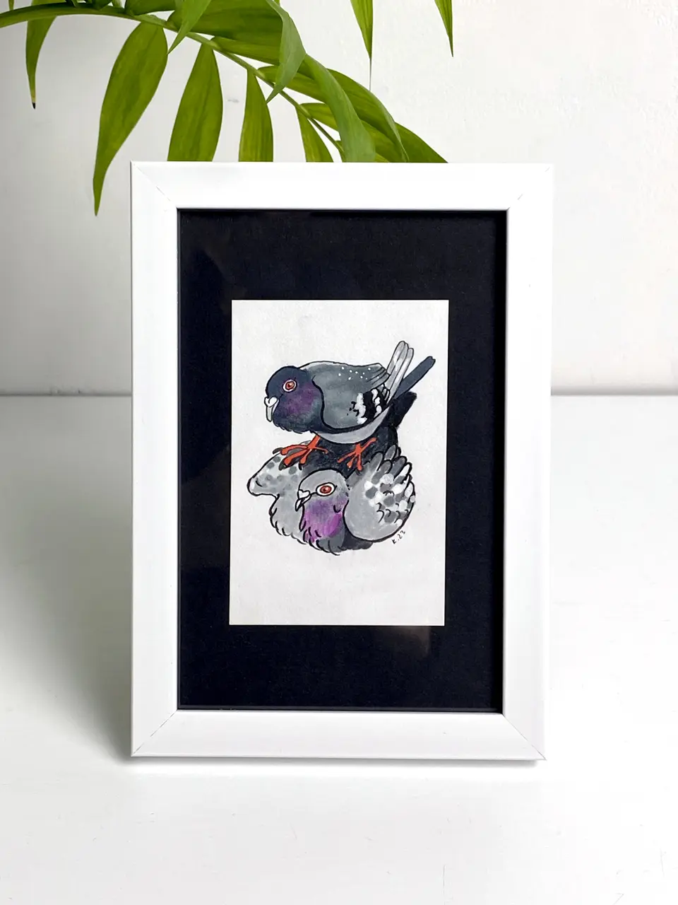 "Loving Pigeons" is a cute little drawing in a simple white frame, which is ready to take its place in your interior, hopefully creating a nice mood :)