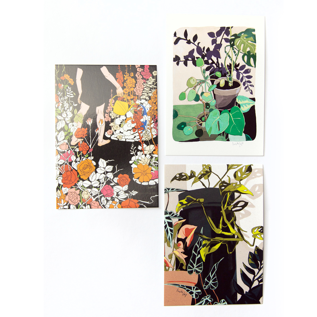 Postkaardikomplekt koosneb kolmest erinevast joonistusest - õitsvatest peenardest toataimedega joonistusteni :)