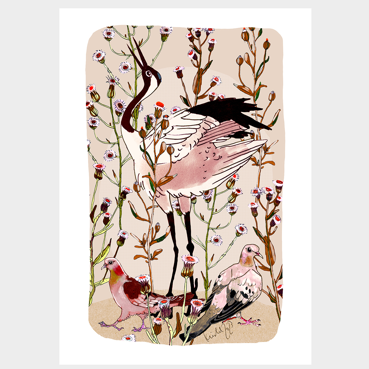 "Õnnekurg, õõnetuvi ja õnnehein" on A4 formaadis (210 x 297 mm) print joonistusest.