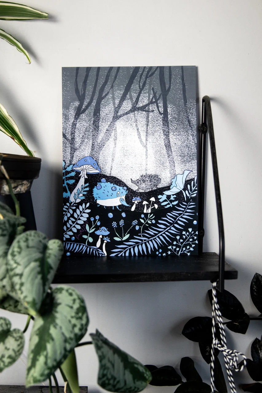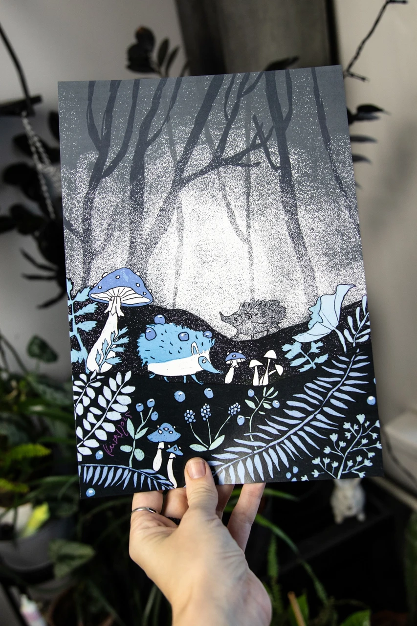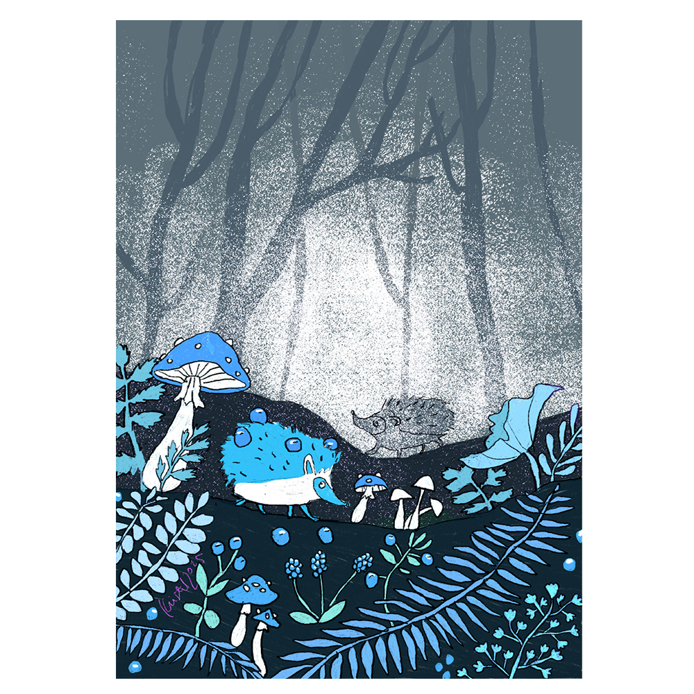A4 formaadis (210 x 297 mm) print joonistusest "Siilid udus".