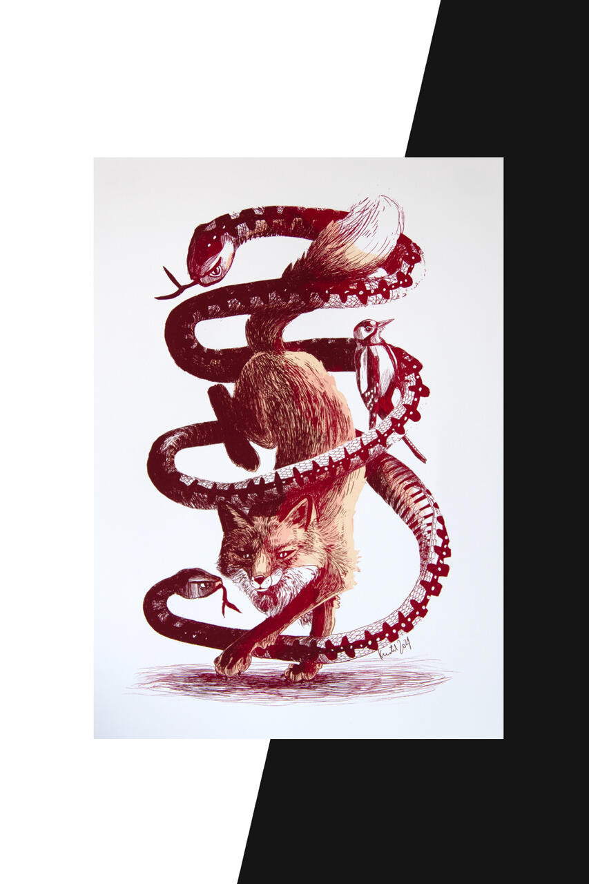 Fox, viper and woodpecker is a print of a drawing : ) The drawing is part of a series "Animals in Alphabetic order" and these animals are part of letter R (rebane, rästik, rähn - fox, viper and woodpecker in Estonian)The format is A4 (210 x 297 mm)