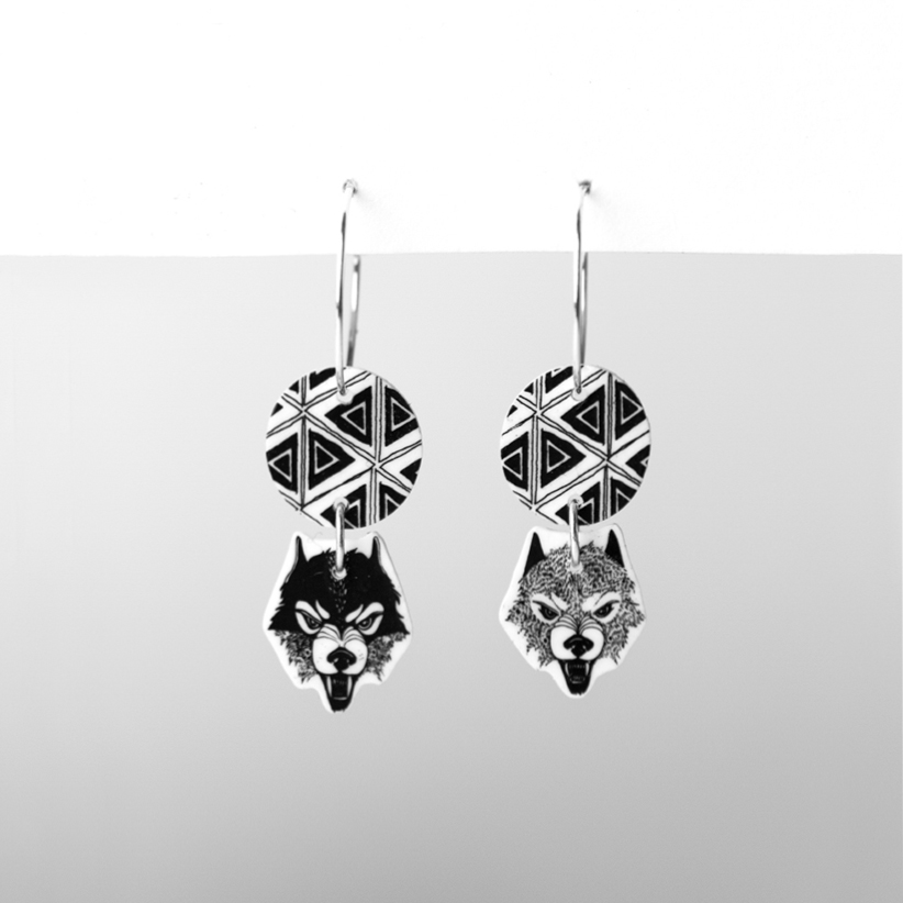 Rippuvad rõnga ja mustrimummuga kõrvarõngad joonistatud kaitsvate huntidega : ) Huntide paar koosneb kahest erinevast disainist - üks neist on hele, teine tume.