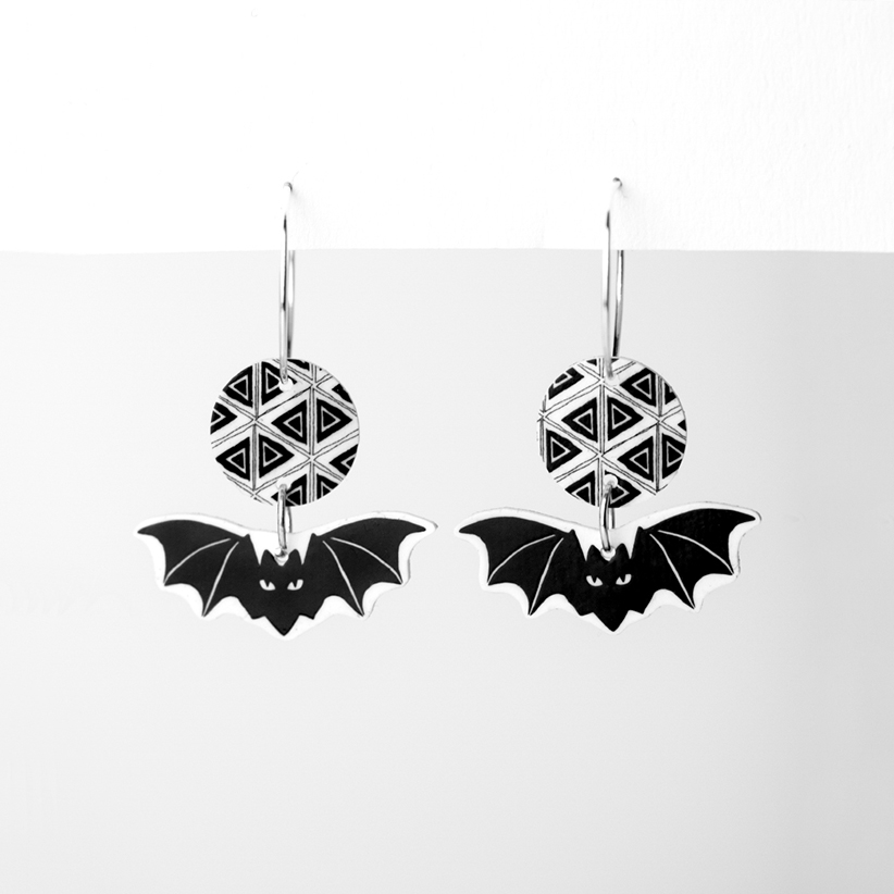Rippuvad rõnga ja mustrimummuga kõrvarõngad joonistatud nahkhiirtega : )