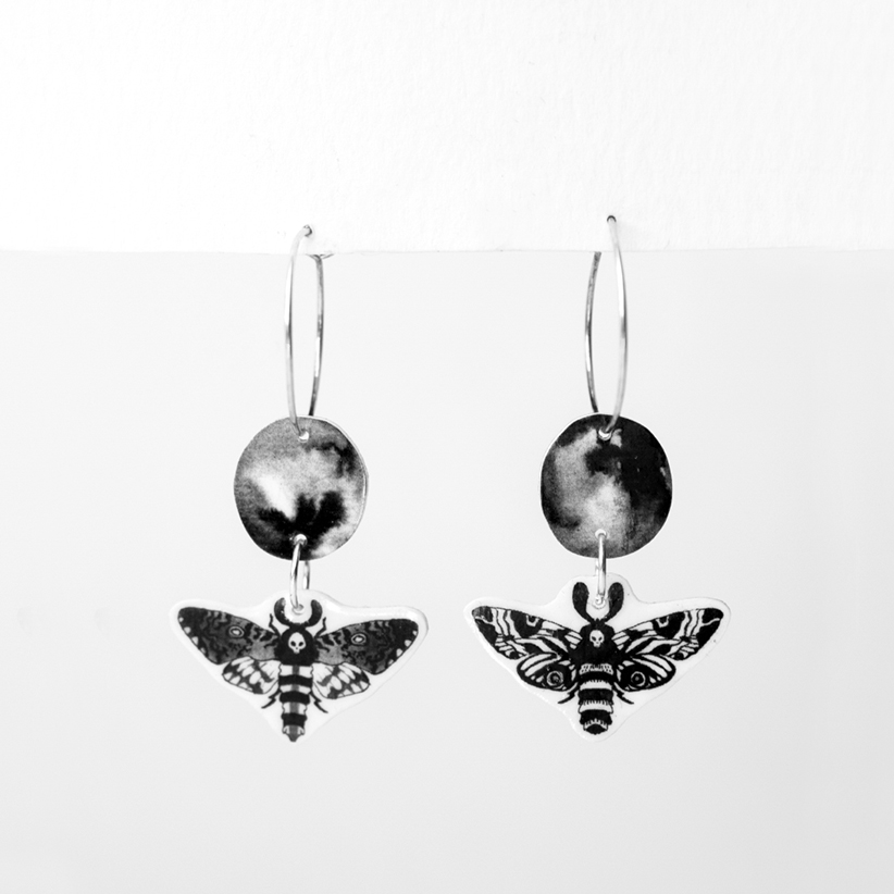 Rippuvad rõngaga kõrvarõngad joonistatud pealuuga ööliblikatega ja täiskuuringiga - olevused, kes vaatavad alati valguse poole : )