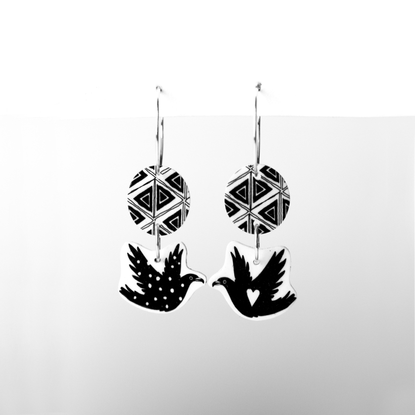 Rippuvad rõnga ja mustrimummuga kõrvarõngad joonistatud südamelindudega : )